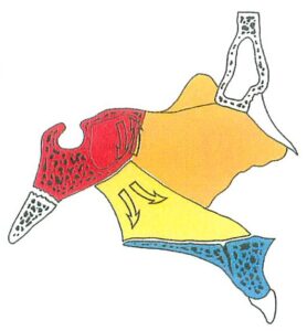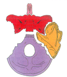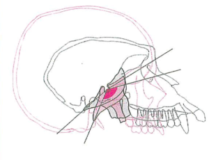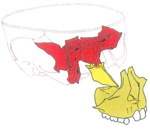 – Hình 7: Kết nối sọ mặt của các xương Chẩm – Bướm – Lá mía – Hàm trên. Xương bướm nằm ở trung tâm sọ, kết nối với các xương đường giữa khác (xương chẩm, xương sàng, xương lá mía). Nó kết nối trực tiếp với xương hàm trên qua xương lá mía và xương khẩu cái. Xương bướm cũng kết nối với xương chẩm bằng một khớp sụn (khớp bướm – chẩm), có chuyển động năng động trong quá trình phát triển khớp cắn. Chuyển động năng động của nền sọ được truyền đến xương hàm trên qua xương lá mía.