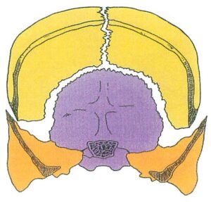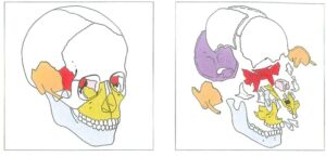 – Hình 1L: Kết nối xương đường giữa và xương thái dương hai bên. Xương đường giữa của sọ thực hiện chuyển động gấp và duỗi. Hai xương đường giữa (cánh lớn xương bướm và xương chẩm) khớp với phần đá xương thái dương. Phần kéo dài đá này hoạt động như trục xoay (trục đá-thái dương) trong các hoạt động vận động.