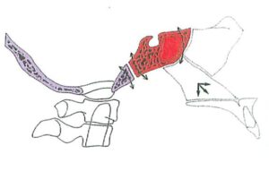 – Hình 10: Kết nối năng động của các xương Bướm – Lá mía – Hàm trên. Xương lá mía đóng vai trò quan trọng trong việc truyền chuyển động sọ đến xương hàm trên. Do đó, chuyển động của nền sọ ảnh hưởng đến sự dịch chuyển xương hàm trên.