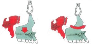 Do đó, trong chỉnh nha truyền thống, headgear kéo cao hoặc miniscrew được dùng để đánh lún răng hàm hàm trên ở sai khớp cắn hạng II; và làm trồi răng hàm hàm trên để tạo chuyển động xoay hàm dưới xuống dưới và ra sau ở sai khớp cắn hạng III.