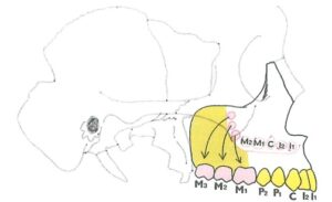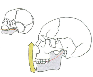 – Hình 5: Sự thẳng đứng hóa xương sọ mặt trong quá trình tăng trưởng và phát triển cá thể. Khi xương sọ mặt tăng kích thước theo chiều thẳng đứng nhiều hơn chiều trước-sau, bộ mặt của người hiện đại tạo ra nhu cầu thích nghi chức năng của hàm dưới để phù hợp với hai hàm răng.