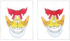 – Hình 17a, 17b: Hình chiếu trước của phức hợp sọ mặt. Kết nối và tư thế của xương bướm, xương thái dương, xương lá mía, xương hàm trên và xương hàm dưới có mối tương quan mật thiết với chức năng động của khớp cắn (a). Mọc quá mức một bên của răng sau tạo ra cản trở phía sau và gây lệch hàm dưới sang bên. Do đó, bệnh nhân phát triển sự mất cân bằng đối xứng của phức hợp sọ mặt (b).