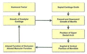 – Các yếu tố răng miệng (răng mọc quá mức hoặc không đủ) có thể dẫn đến sai khớp cắn hạng II hoặc III do thay đổi kích thước dọc phía sau, liên quan mật thiết với tăng trưởng khung xương hàm mặt.