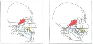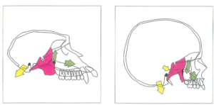 – Hình 13: Kết nối theo chiều trước-sau của các xương Chẩm – Bướm – Lá mía – Hàm trên. Chuyển động gấp – duỗi của nền sọ ảnh hưởng đến hướng dịch chuyển của xương hàm trên, tiếp theo là tăng trưởng đường khớp.
