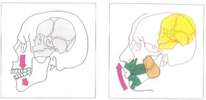 – Hình 1a, 1b: Cấu trúc phức hợp sọ mặt. Hộp sọ gồm nhiều xương phức tạp tạo thành vỏ xương rỗng chứa não và các cơ quan cảm giác, là nền tảng cho răng và cơ nhai. Ở giai đoạn tăng trưởng, các xương ở trạng thái linh hoạt và có mối tương quan năng động. Các thành phần có khả năng thích ứng với chức năng của sọ. Sọ là khung cấu trúc cho giai đoạn đầu của hệ tiêu hóa và cơ quan nhai. Sự cân bằng chức năng của xương sọ mặt chịu ảnh hưởng bởi các chức năng khớp cắn như nhai, thở, nói, nghiến chặt và nghiến răng.