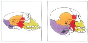 – Hình 2a, 2b: Cấu trúc sọ người và linh trưởng. Sự kết nối xương Chẩm – Bướm – Lá mía – Hàm trên ở sọ linh trưởng (a) có kích thước trước-sau dài hơn ở người (b). Sọ người cho thấy sự giãn nở hộp sọ thần kinh và giảm sô hàm mặt. Vị trí lỗ lớn thay đổi do hiệu ứng thẳng đứng của sọ và tăng kích thước não. Hậu quả là sọ người phát triển rộng và thẳng đứng hơn sọ linh trưởng.